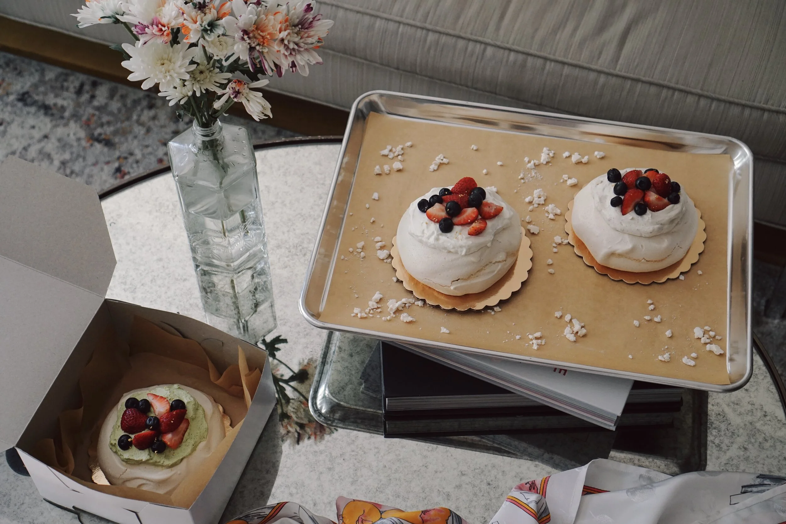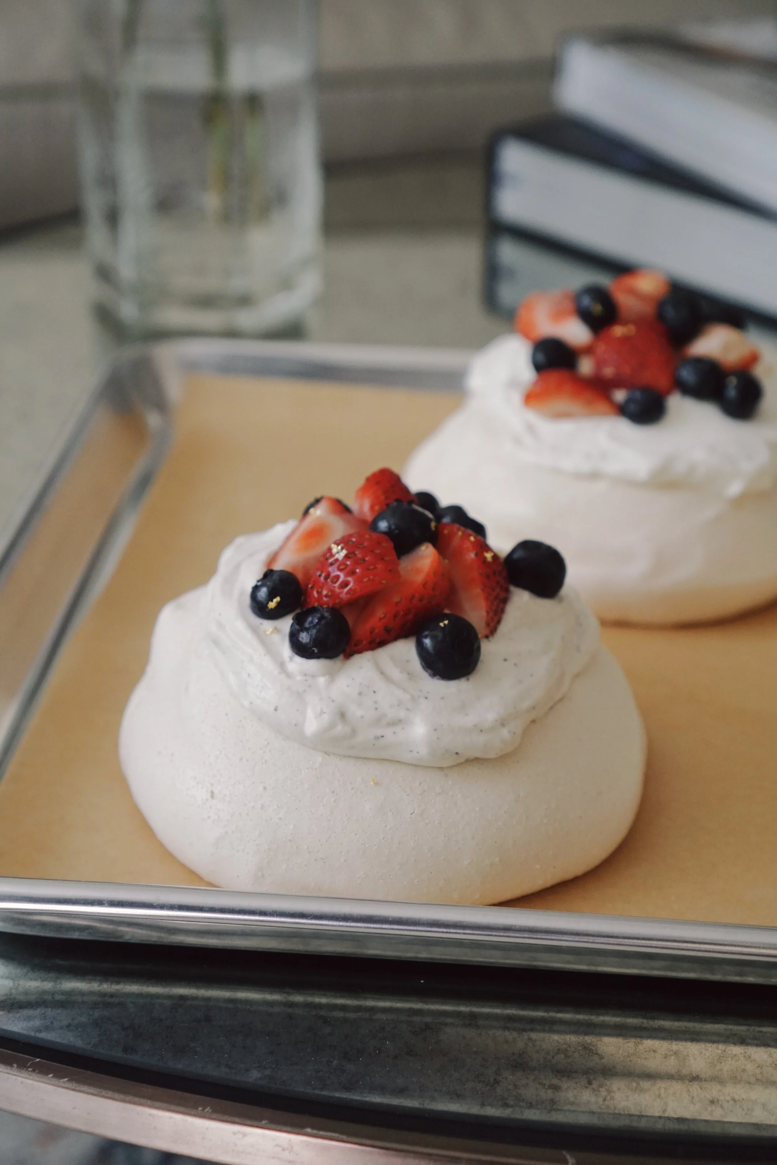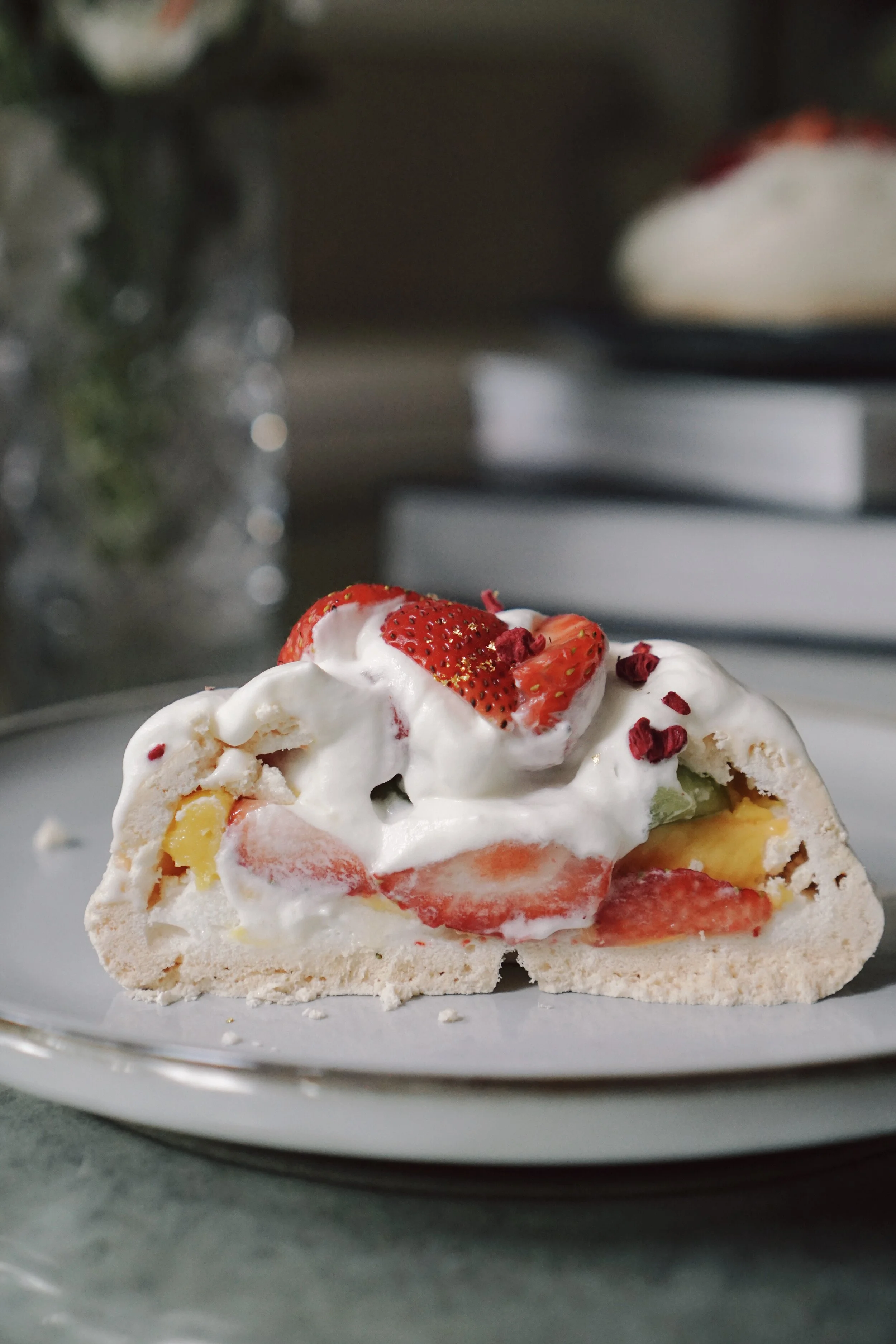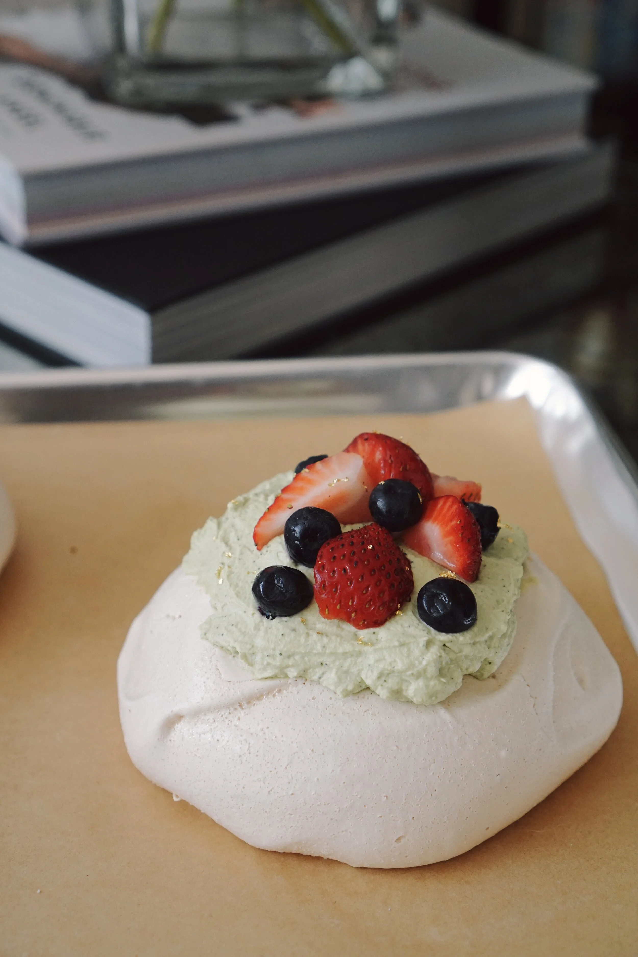 Each pavlova is filled with fruits and a crème pâtissière of your choosing, topped with a freshly whipped chantilly cream and strawberries.